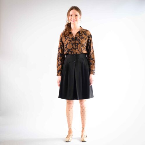 Coupe légèrement oversize avec col officier boutonné, encolure fendue et délicatement froncée. Empiècement à la carrure dos souligné par un pli creux. Manches longues fendues, terminées par un poignet boutonné.