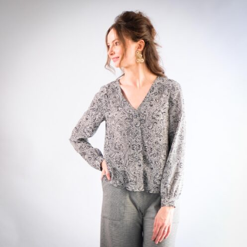 Coupe oversize avec col chemisier, prolongé par une pâte de boutonnage. Emmanchures légèrement descendues et manches longues fendues terminées par un poignet boutonné. Empiècement carrure dos souligné par un plis creux. Jeu de contrastes : coudières et pied de col dans un imprimé différent qui apporte une pointe de fantaisie.