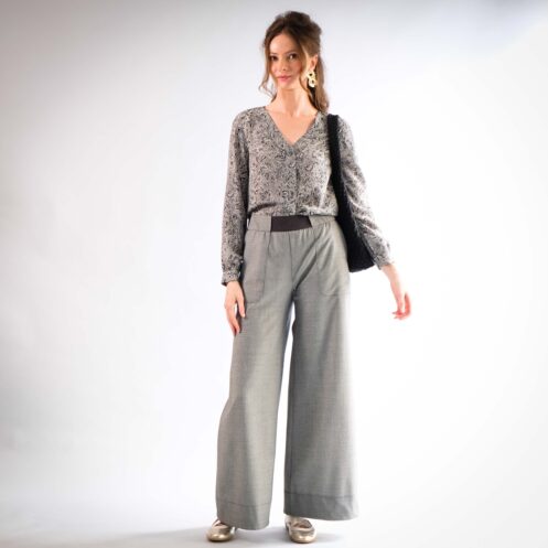 Taille haute soulignée par une ceinture large, élastiquée au dos pour un confort optimal. Jambes larges et droites. Découpe dans le dos et poches italiennes.