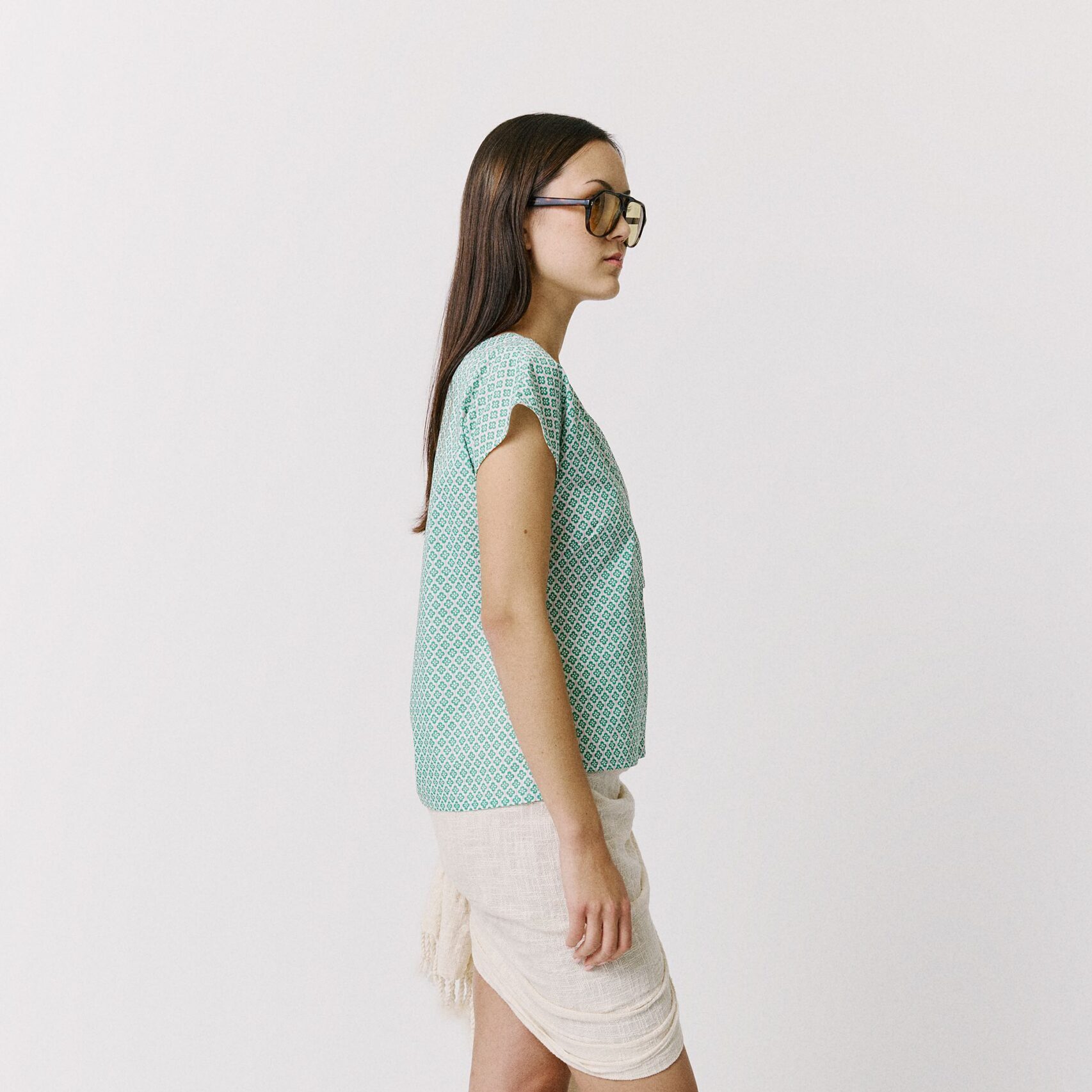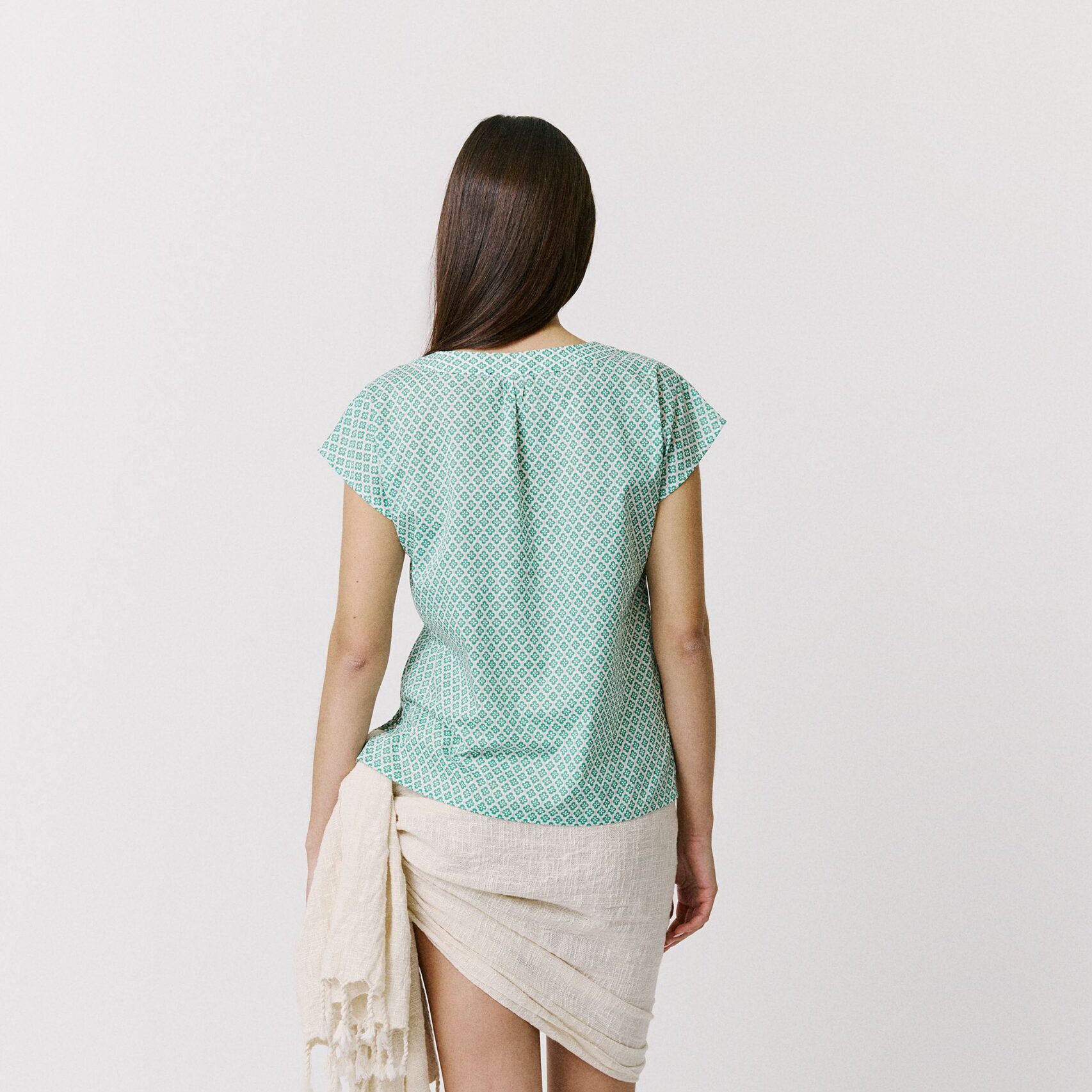 Sa coupe légèrement cintrée dessine une silhouette élégante, le décolleté fendu apporte une touche délicate, tandis que les petites manches, subtilement froncées aux épaules et dans le dos donnent du relief à l’ensemble.