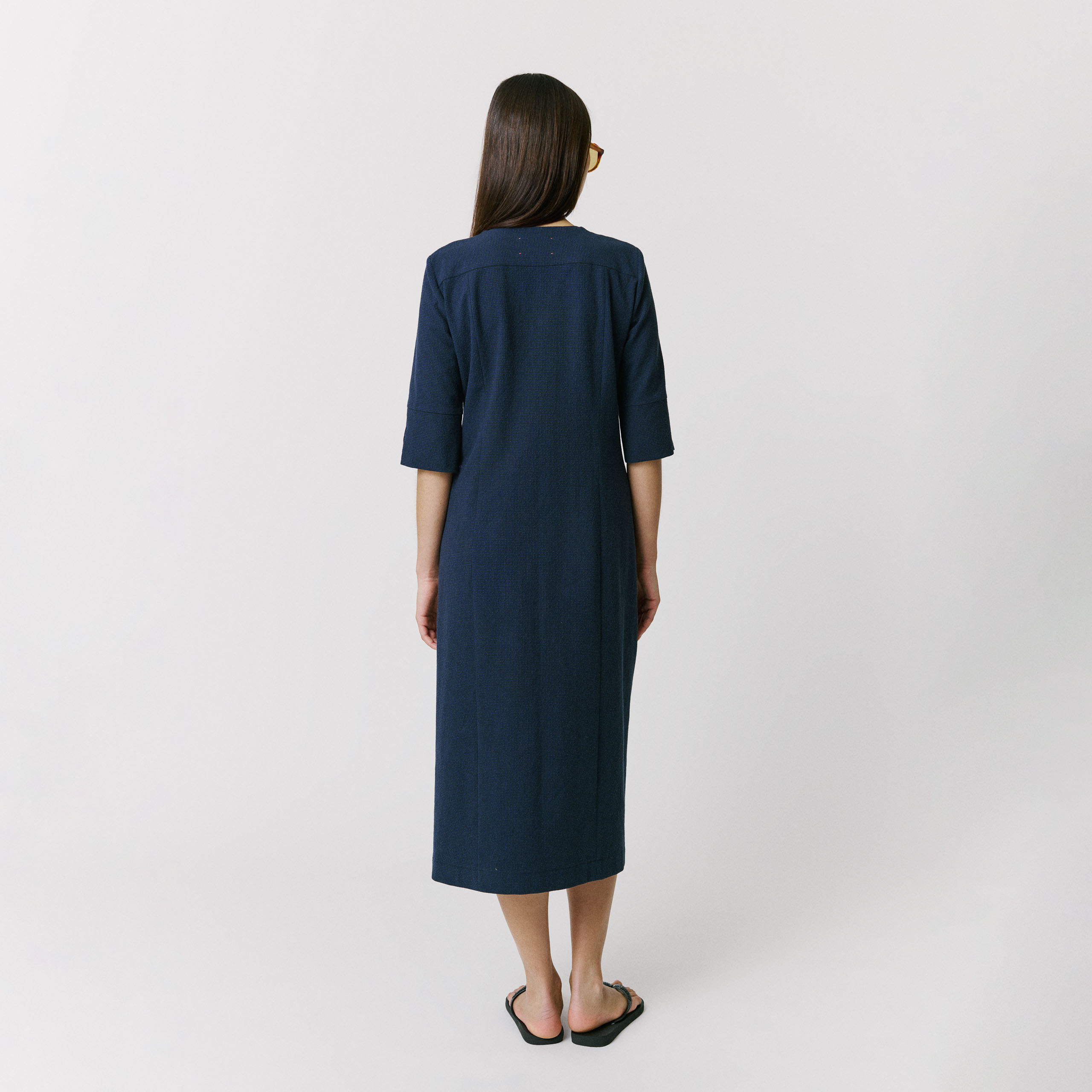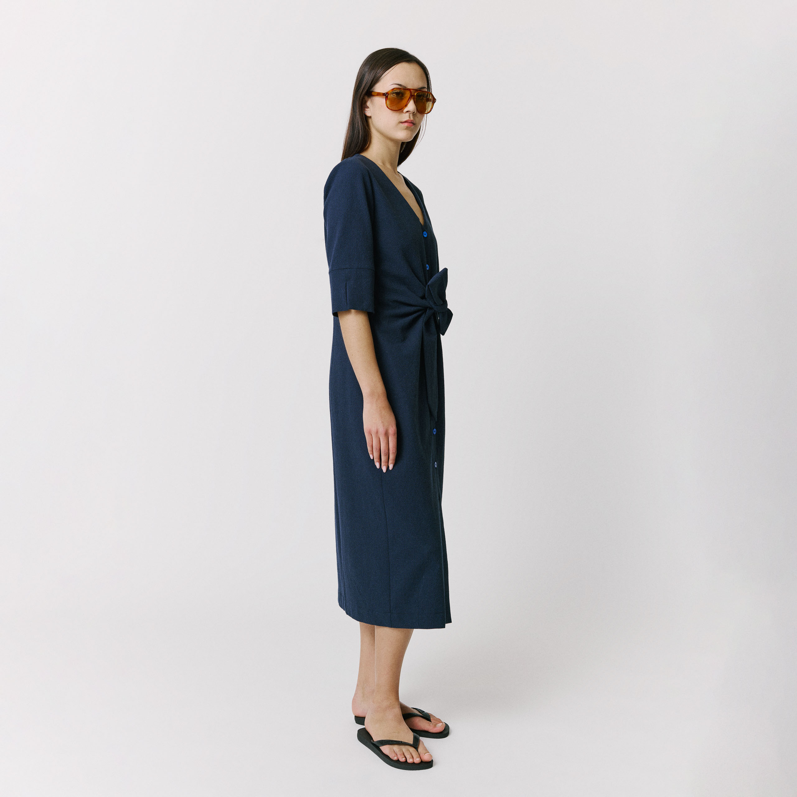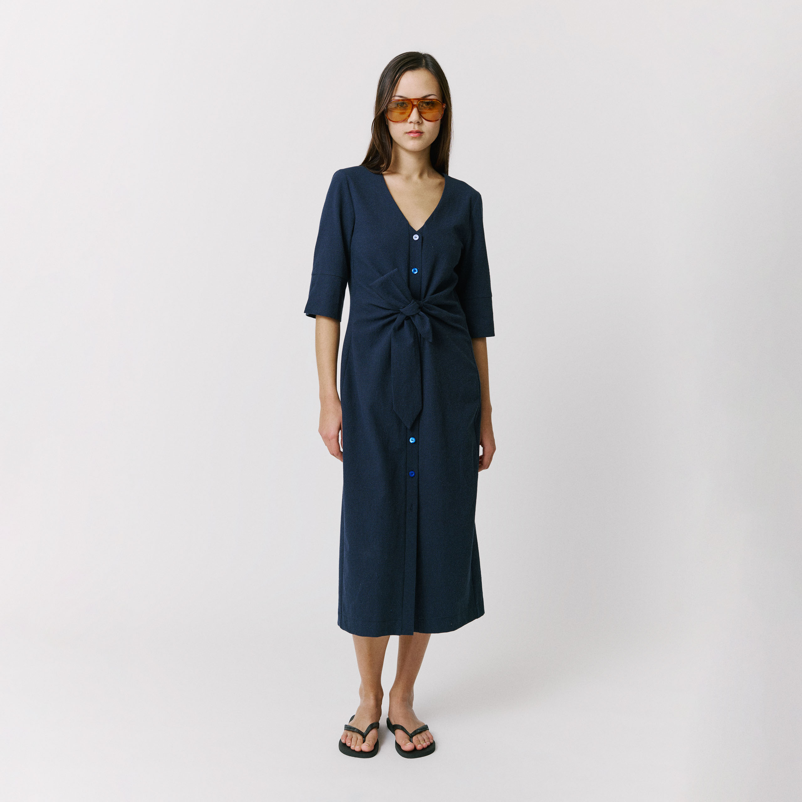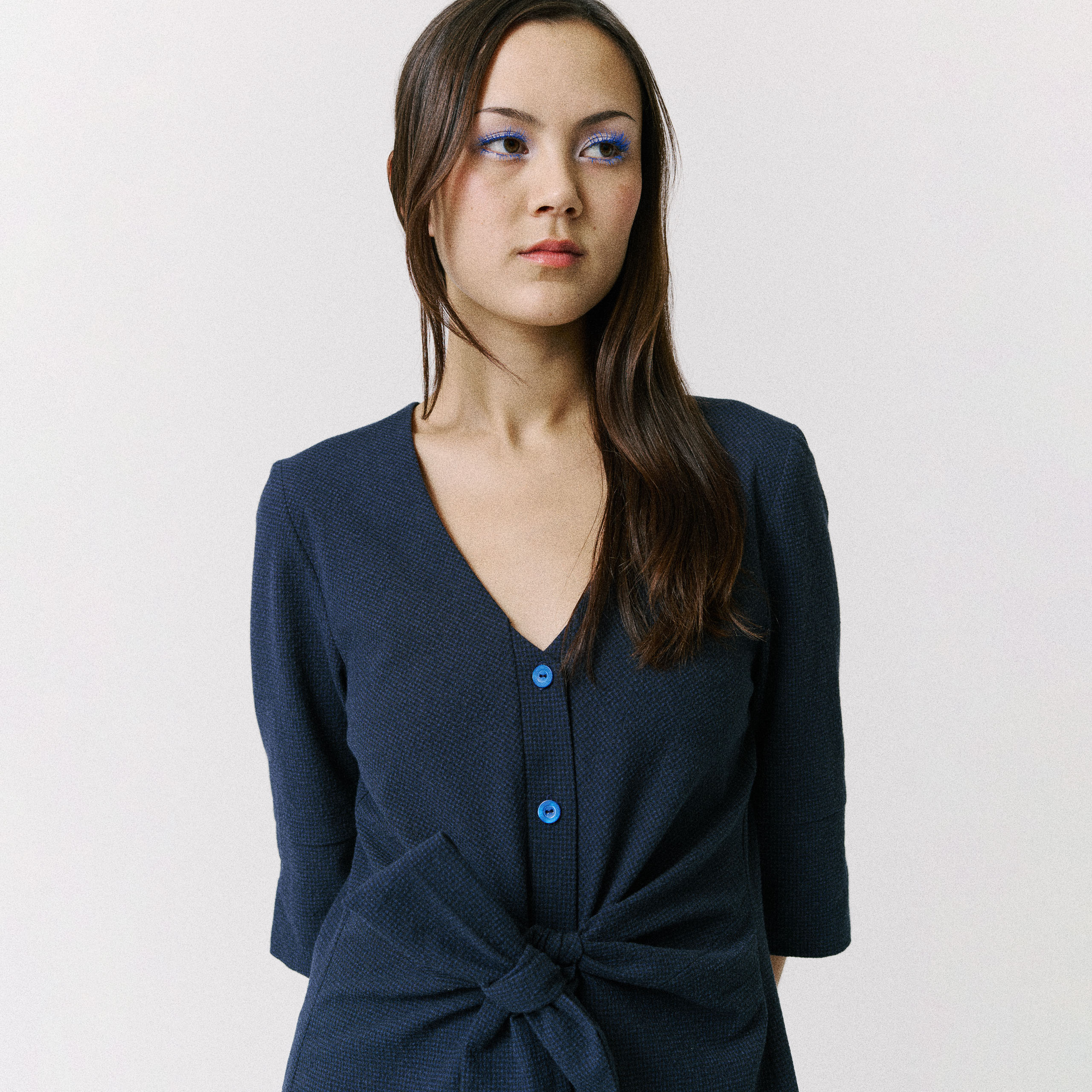 Coupe mi-longue ajustée par des découpes sur le devant et le dos, et soulignée par un nœud à nouer à la taille. L’encolure en V est prolongée par une patte de boutonnage simple. Manches 3/4 qui se terminent par des poignets fendus, pour une silhouette à la fois féminine et facile à porter.