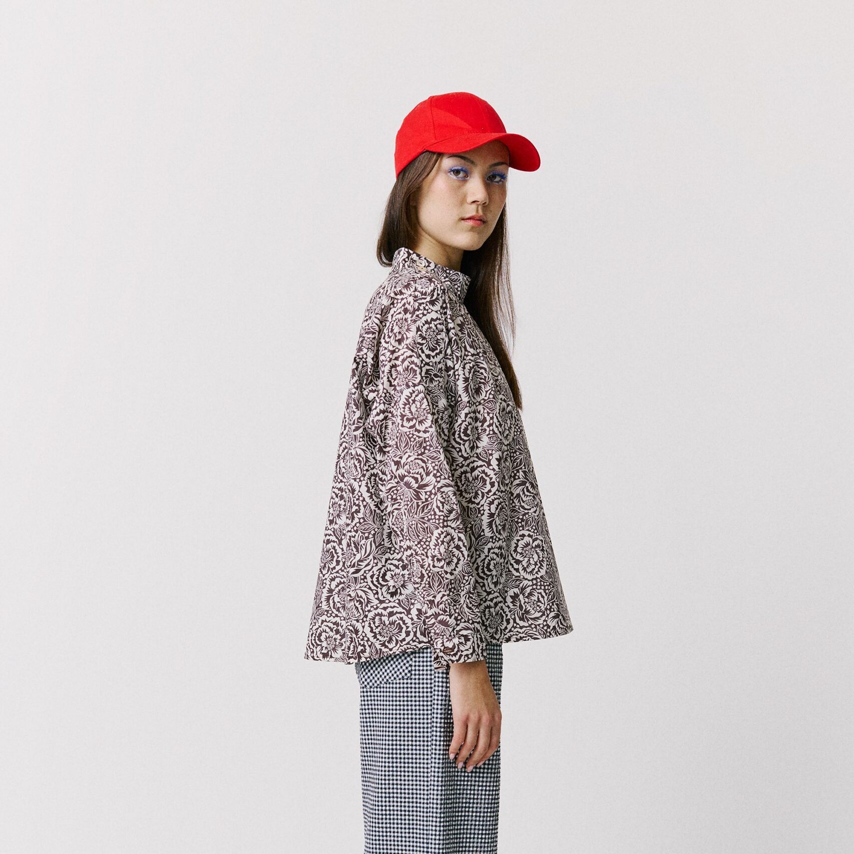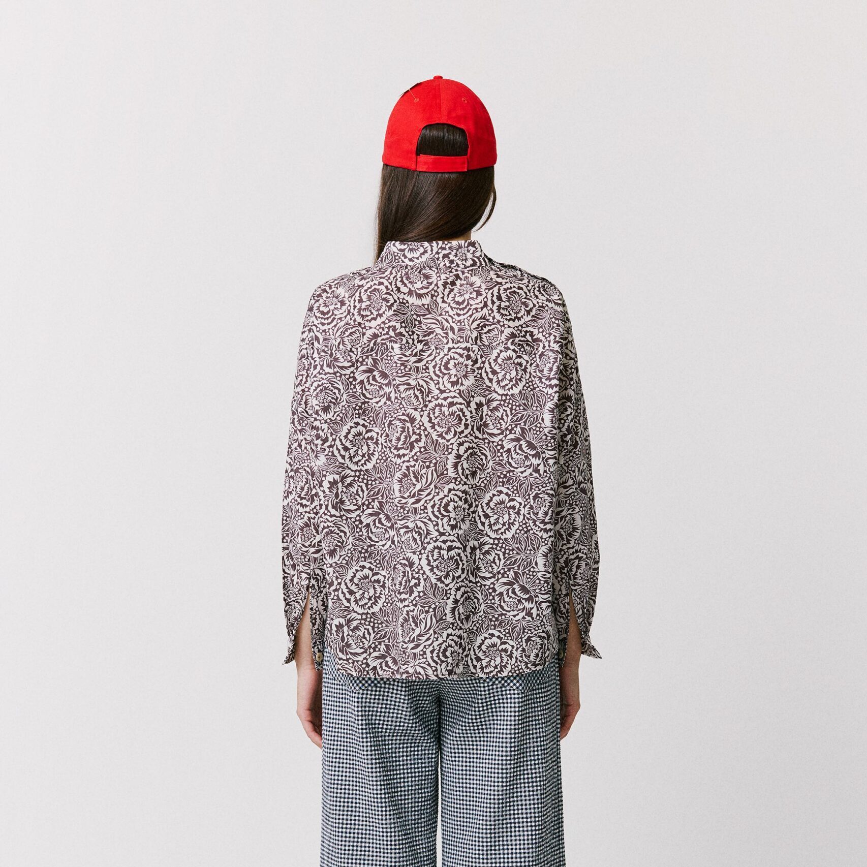 Sa coupe très ample, ponctuée de petites fentes sur les cotés, offre une belle liberté de mouvement. Col montant, souligné par une patte de boutonnage sur l’épaule. Manches longues, finies par des poignets fendus et boutonnés, pour une silhouette facile à porter.