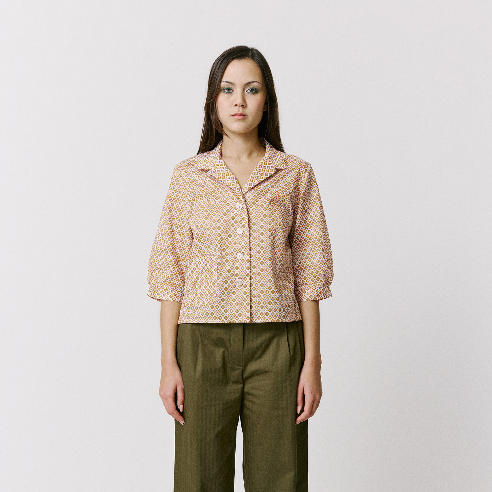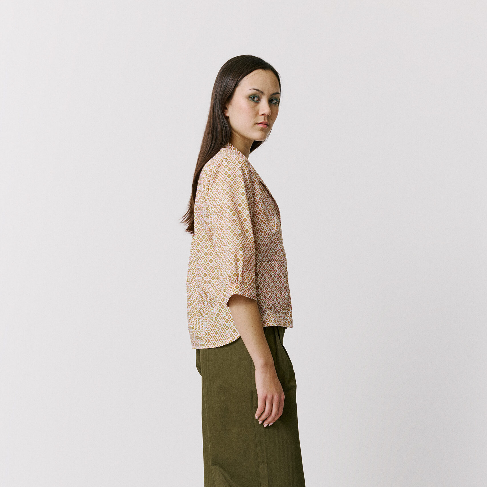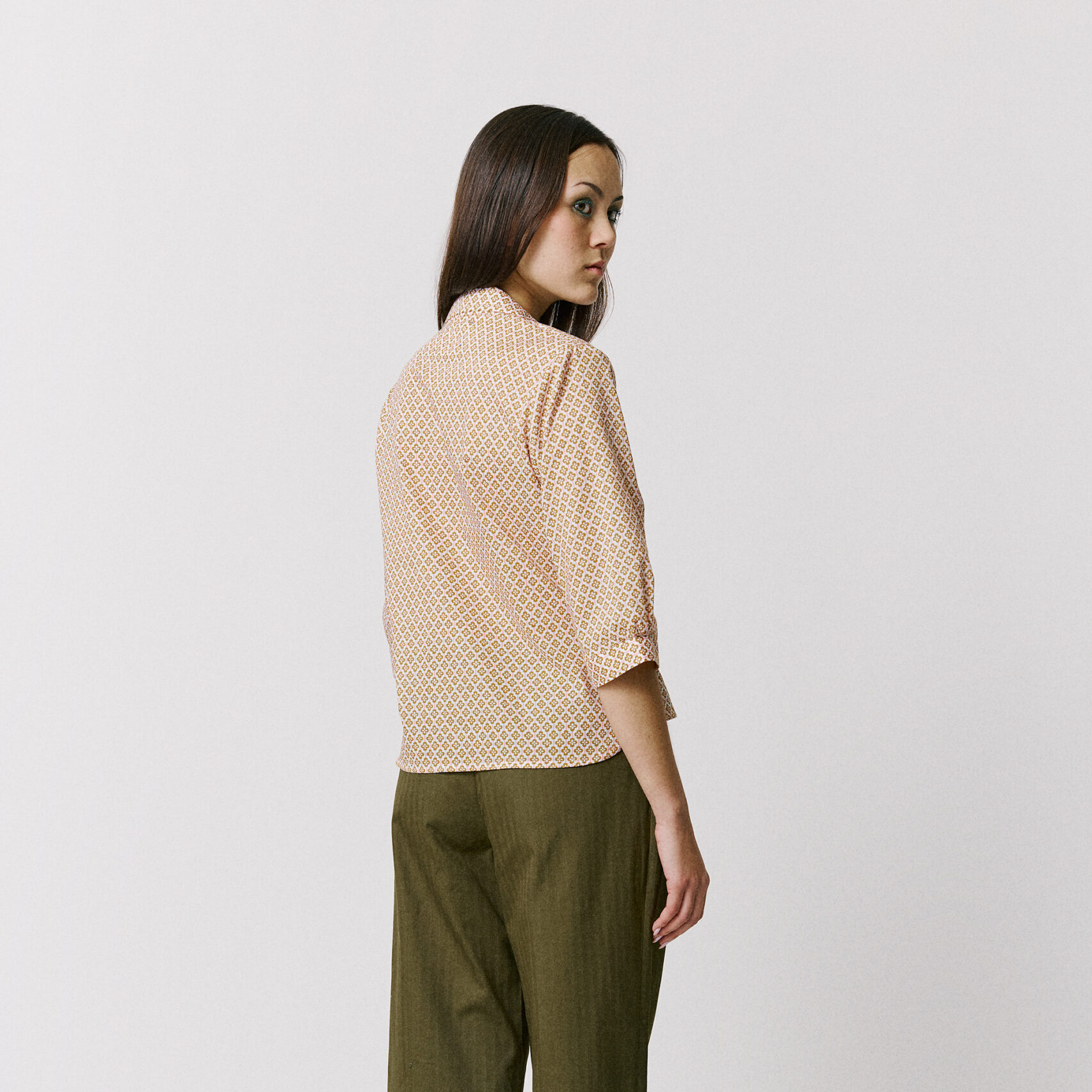 Coupe légèrement cintrée, fendue sur les côtés, avec un ourlet arrondie subtilement plus long à l’arrière. Col chemisier aux bouts arrondis, prolongé par une patte de boutonnage simple. Manches 3/4 légèrement bouffantes, resserrées par un petit poignet. Il peut aussi se porter ouvert, comme une petite veste légère.