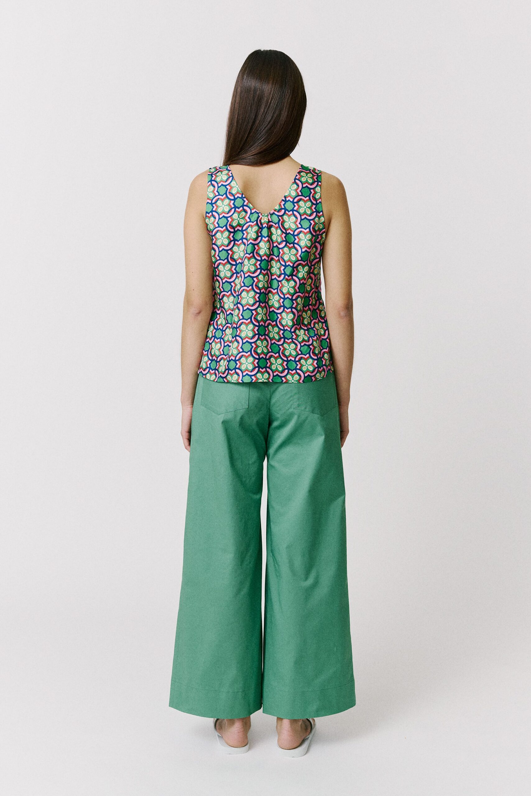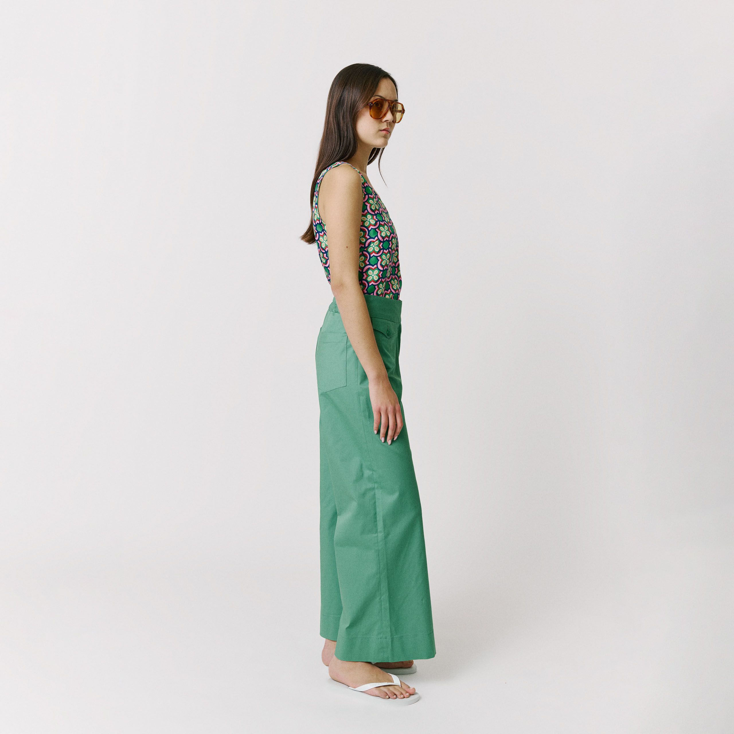 Jambes larges et évasées pour une silhouette longiligne. Taille haute mise en valeur par une ceinture asymétrique, élastiquée au dos pour plus de confort. Poche ticket à rabat sur le devant et poches plaquées au dos.