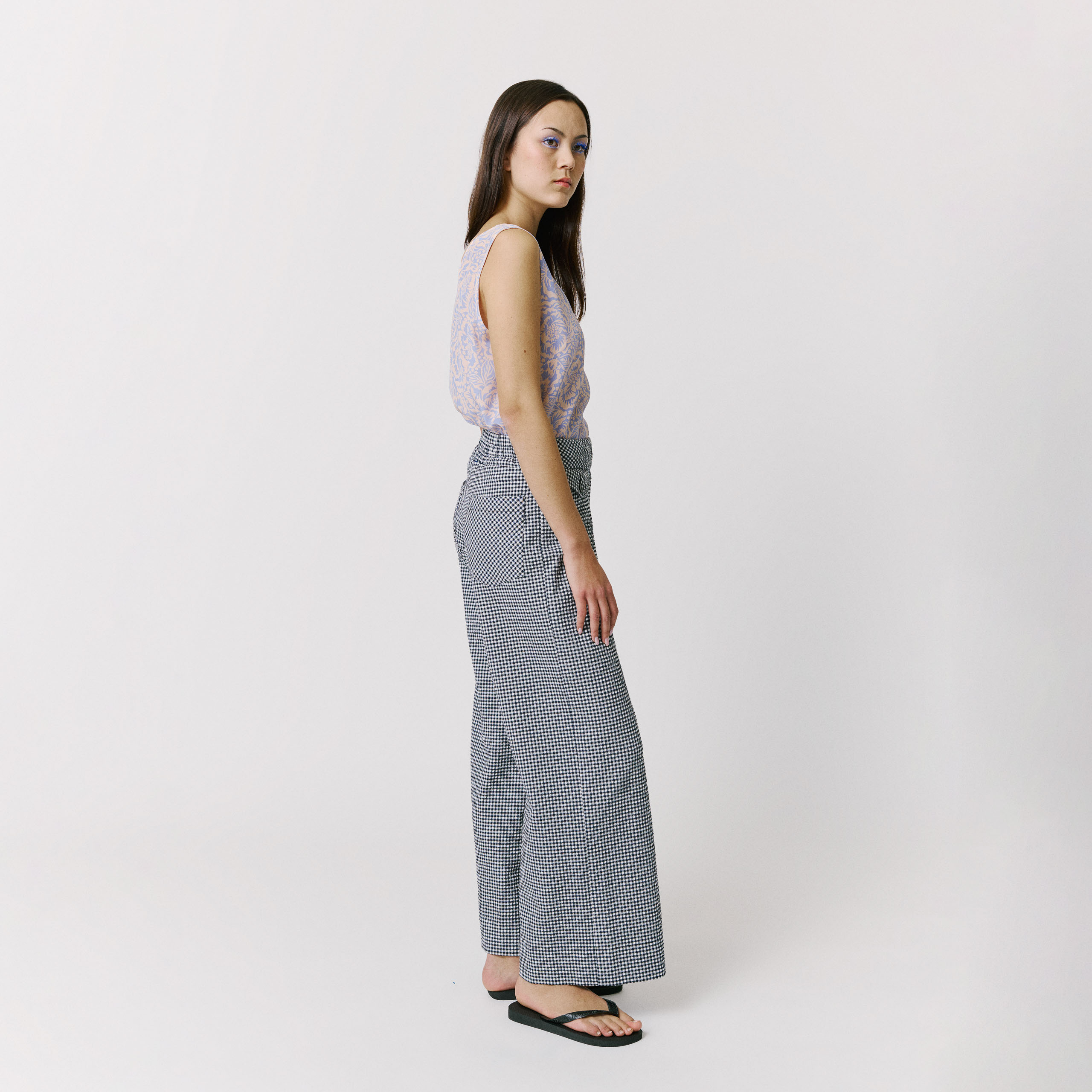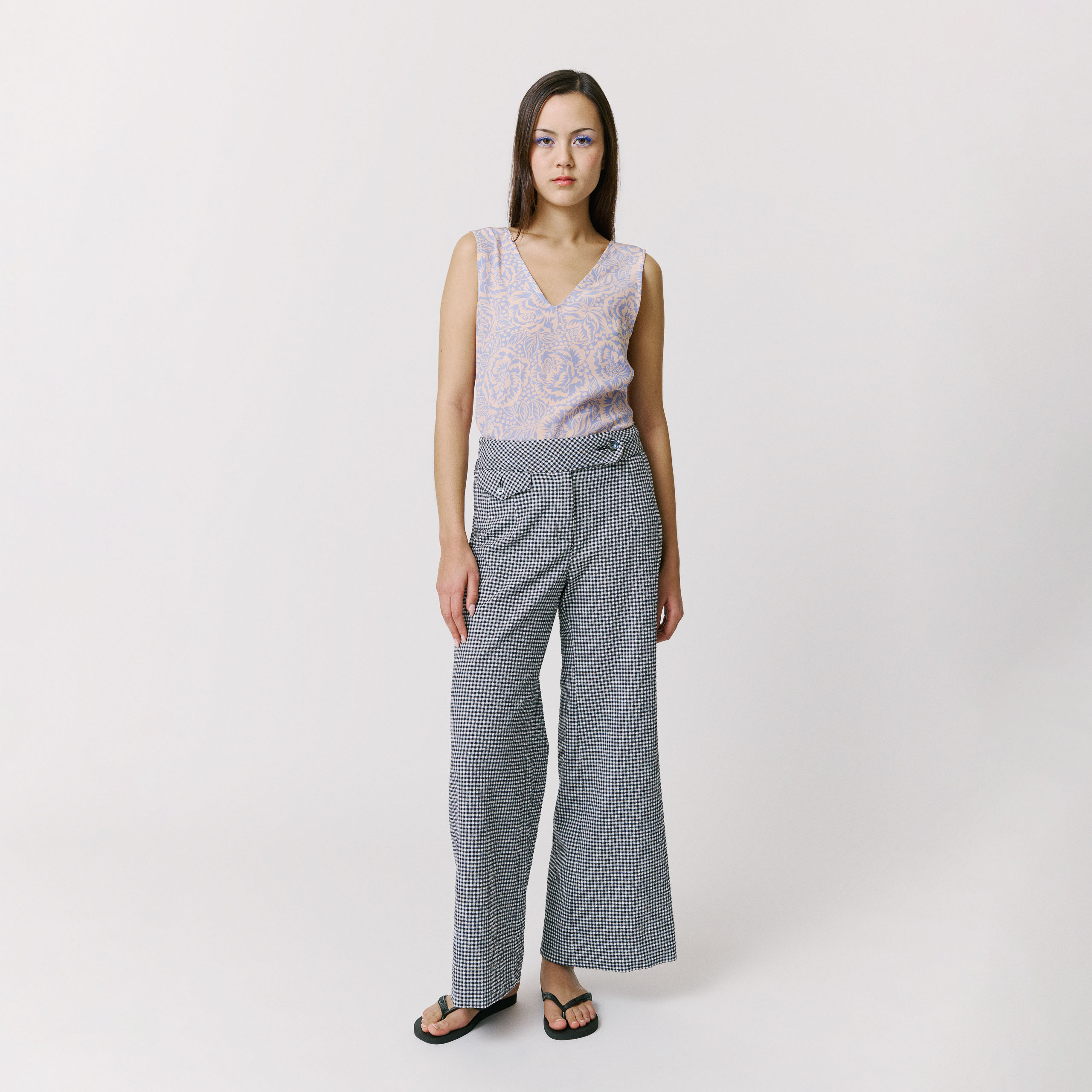 Jambes larges et évasées pour une silhouette longiligne. Taille haute mise en valeur par une ceinture asymétrique, élastiquée au dos pour plus de confort. Poche ticket à rabat sur le devant et poches plaquées au dos.