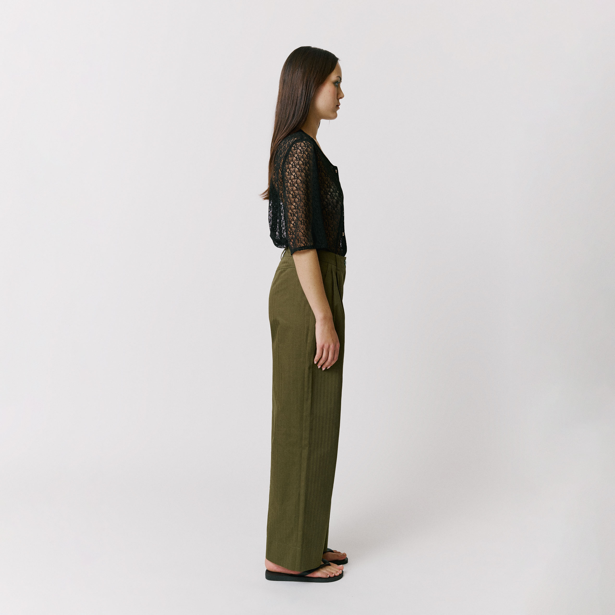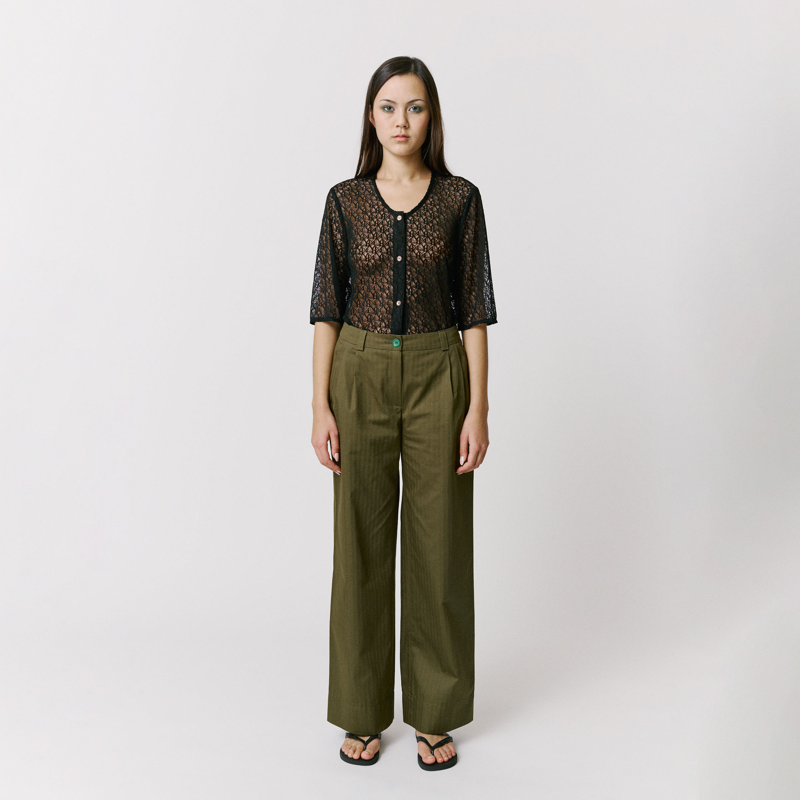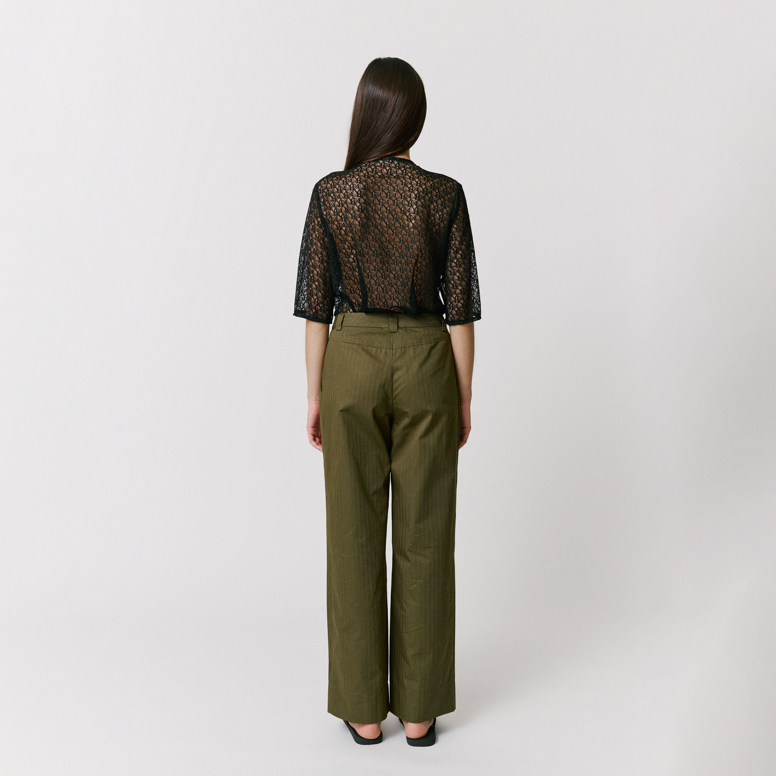 Jambes droites et amples pour être confortable. Ceinture avec passants, poches italiennes et découpe au dos pour une jolie allure.