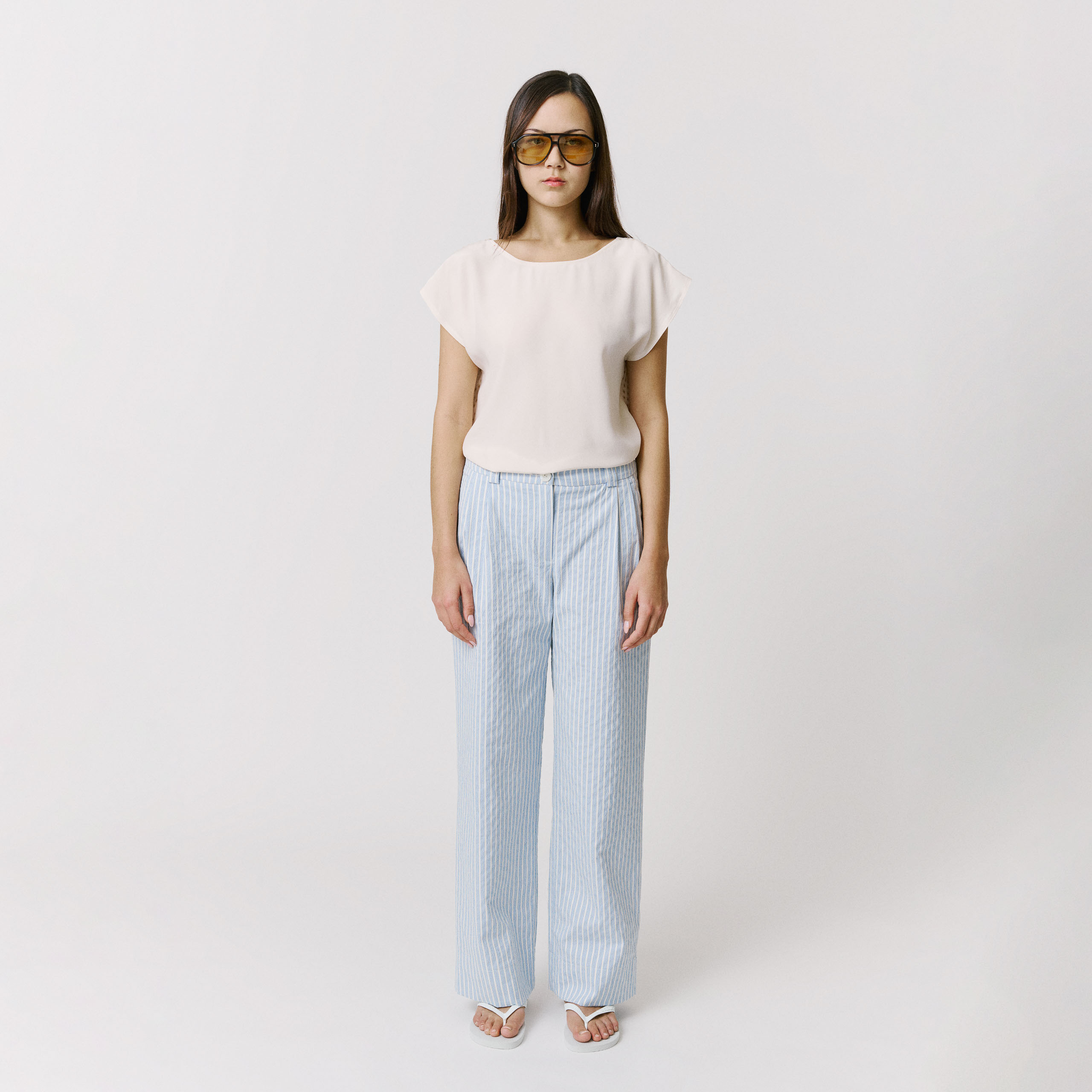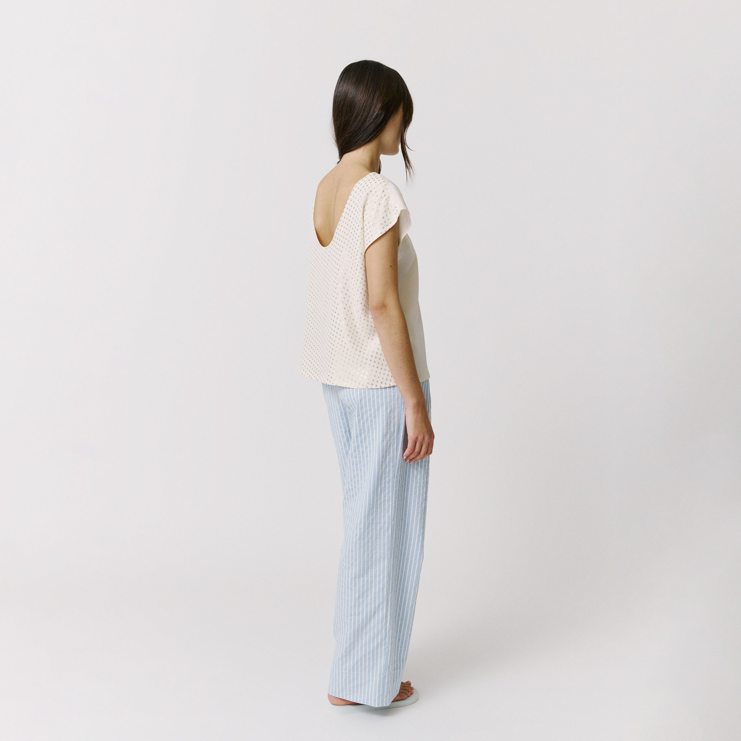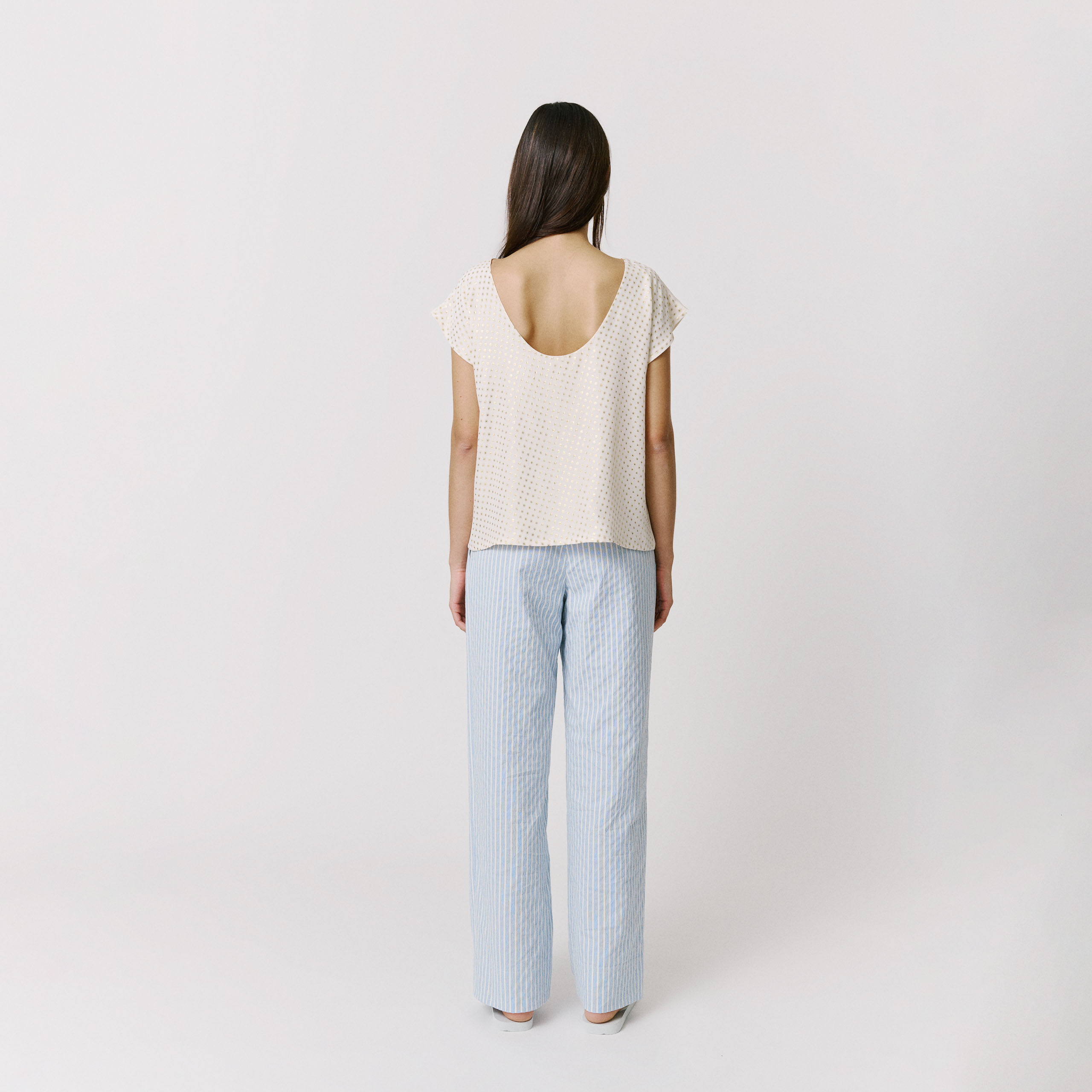 Jambes droites et amples pour être confortable. Ceinture avec passants, poches italiennes et découpe au dos pour une jolie allure.